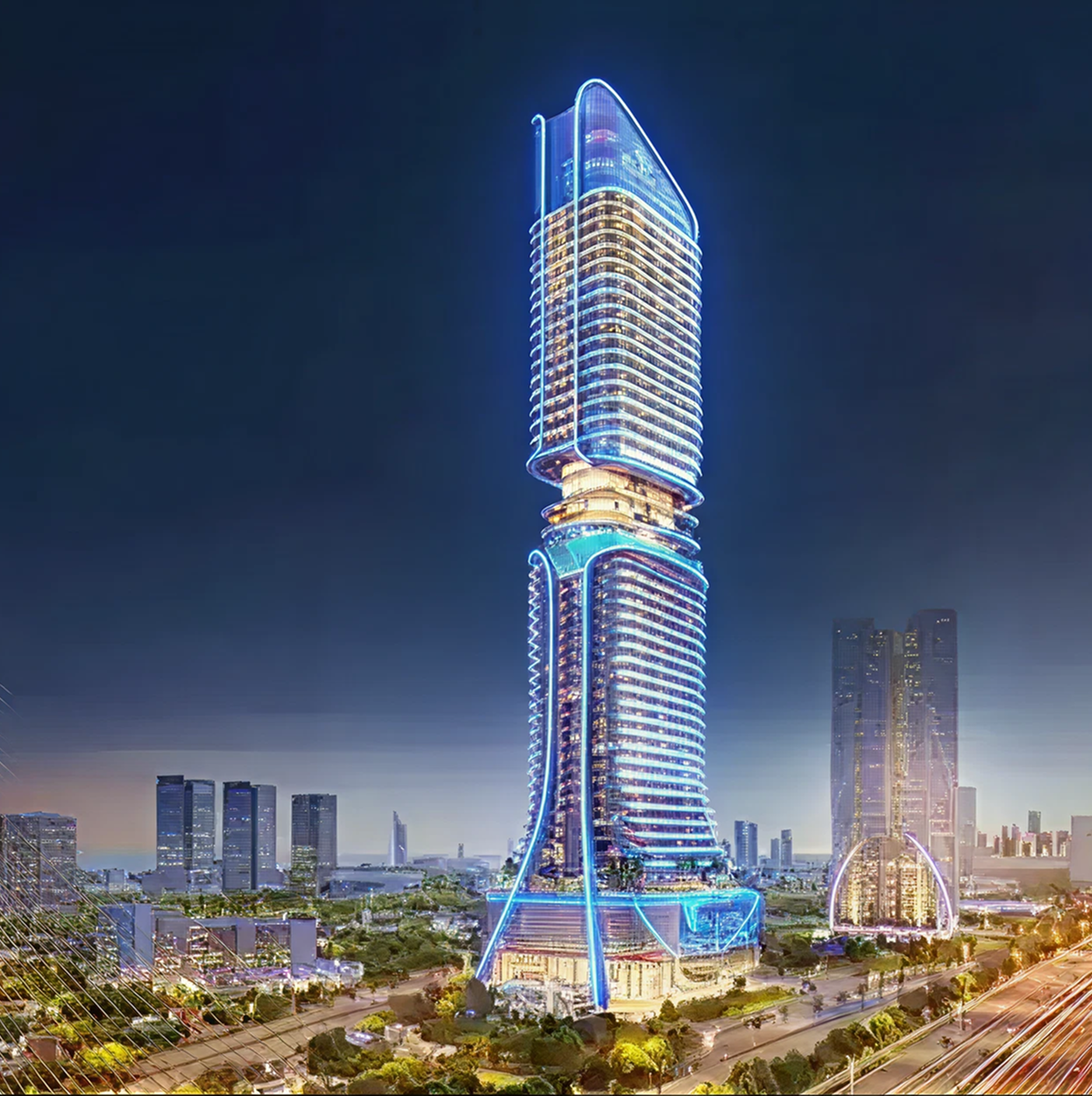 Discover the G+55 ultra-luxury tower co-branded with Shah Rukh Khan, featuring a triple-height grand lobby and sleek, modern facade that exudes prestige on Sheikh Zayed Road.